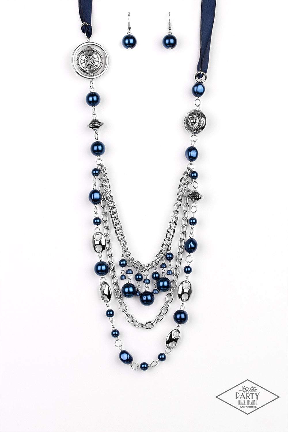 A silky blue ribbon replaces a traditional chain to create a timeless look. Pearly deep blue beads and funky silver pieces intermix with varying lengths of silver chains to give a fresh take on a Victorian-inspired piece.