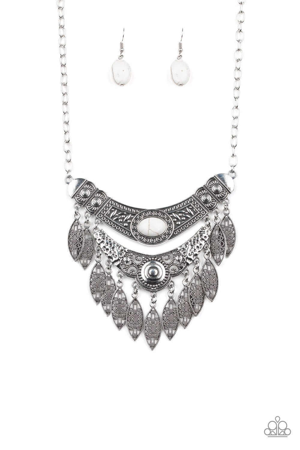 Featuring a collision of hammered, studded, and embossed patterns, two silver half-moon plates dramatically stack below the collar. Swirling with studded filigree detail, ornate silver frames swing from the bottoms of the stacked pendants, creating a fierce tribal inspired fringe. A refreshing white stone is pressed into the center of the uppermost frame for seasonal finish. Features an adjustable clasp closure.