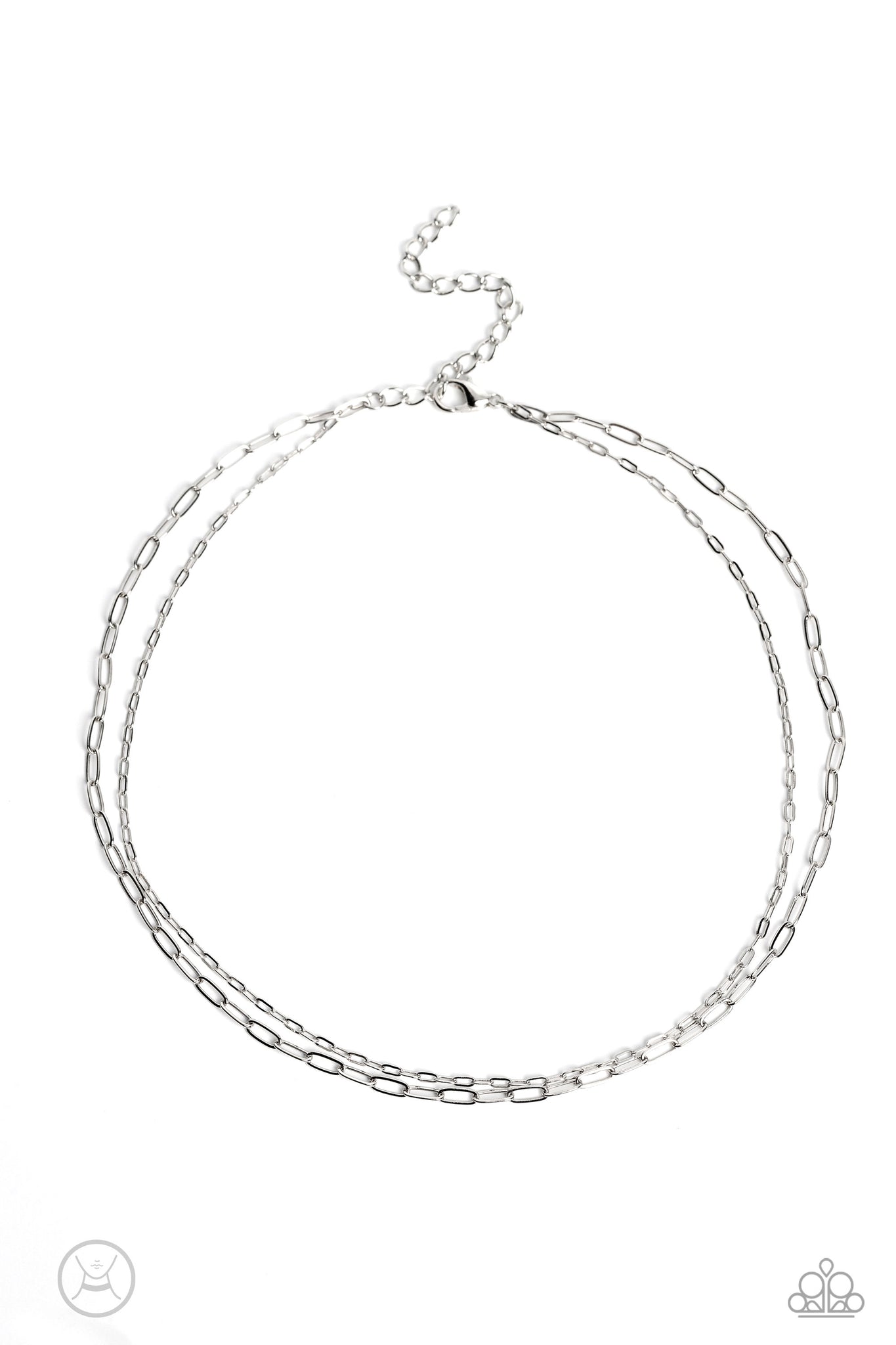 A dainty duo of silver paperclip chains coalesces down the neckline, with one chain slightly bigger than the other to emphasize its high-sheen, monochromatic simplicity. Features an adjustable clasp closure.