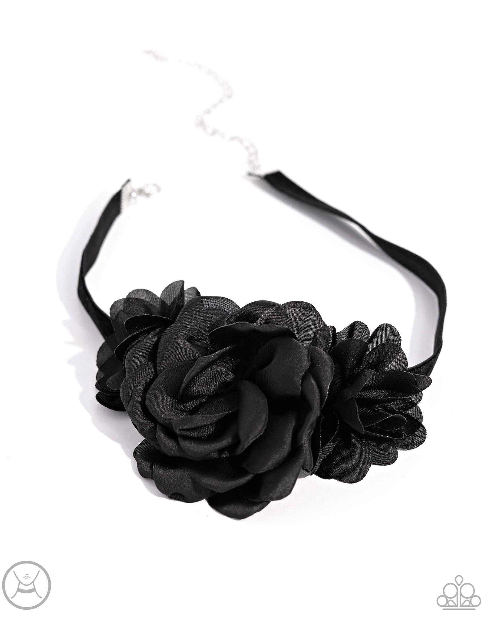 Attached to a silver adjustable chain, a black tulle ribbon wraps around the collar. Three tulle black roses adorn the center of the design for a whimsical finish. Features an adjustable clasp closure.