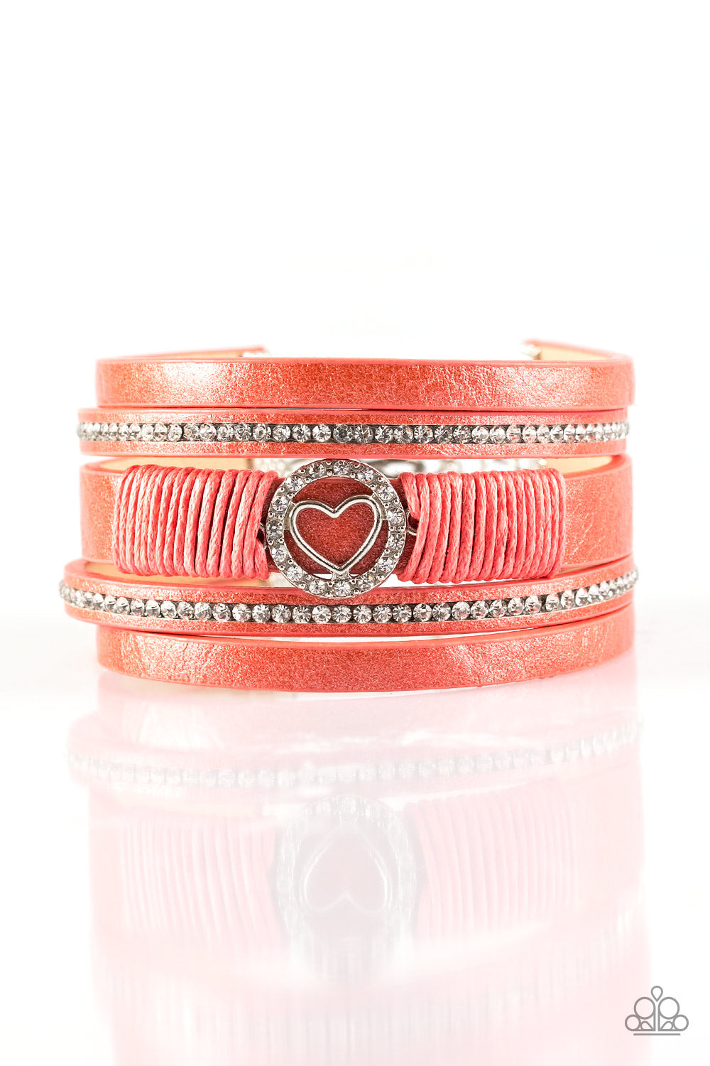 Brushed in a metallic shimmer, strips of orange leather are encrusted in alternating rows of glittery white rhinestones. Orange cording knots around the centermost strand, securing a sparkling heart frame in place for a whimsical finish. Features an adjustable clasp closure.