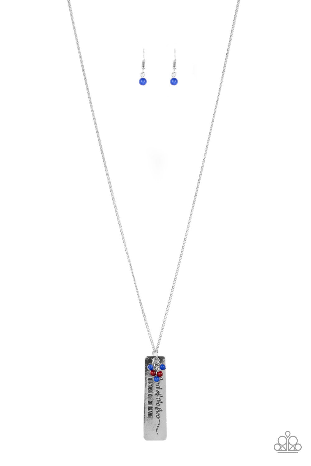 Infused with a cluster of dainty blue and red cat's eye beads, a silver plate is stamped in the phrase, "Land Of The Free Because Of The Brave", for a whimsical finish. Features an adjustable clasp closure.