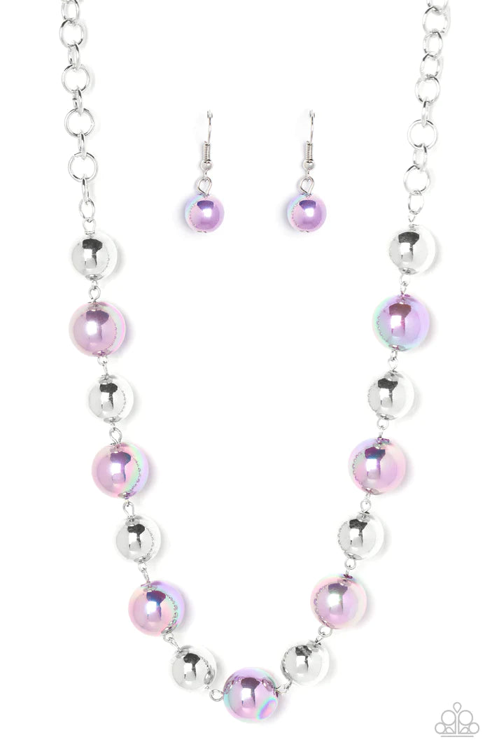 Dipped in an iridescent finish, oversized lavender pearls alternate with shiny silver beads below the collar for a dreamy pop of shimmer. Features an adjustable clasp closure.