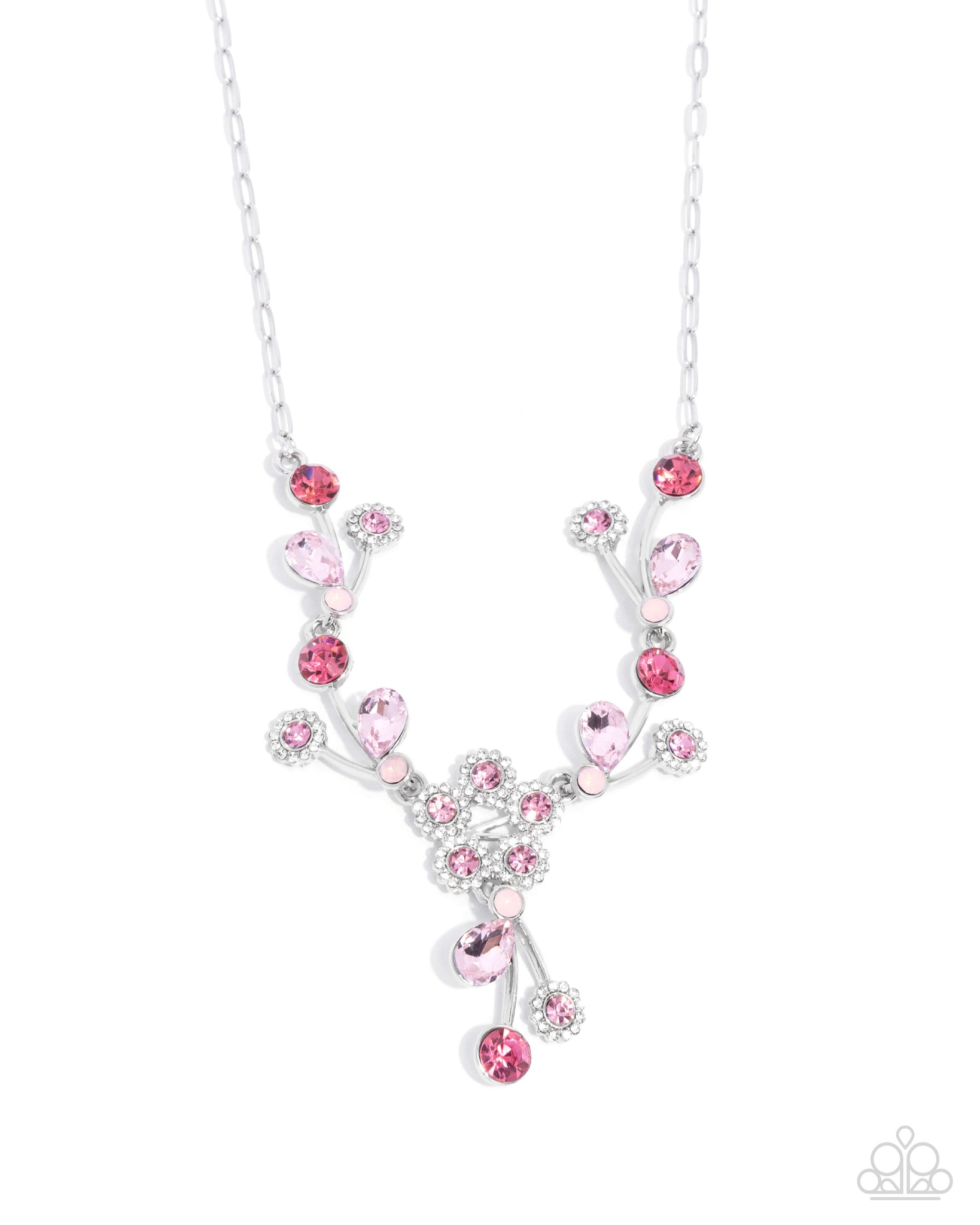 Attached to a dainty silver paperclip chain, a collection of silver stems blooming with light rose-centered white rhinestone flowers, pink teardrop gems, and solitaire rose and opalescent rose rhinestones connects below the neckline to a floral pendant made up of the light rose-centered white rhinestone flowers. An additional silver stem blooming with the same pink centerpieces sways below the center of the design for a whimsical finish. Features an adjustable clasp closure.