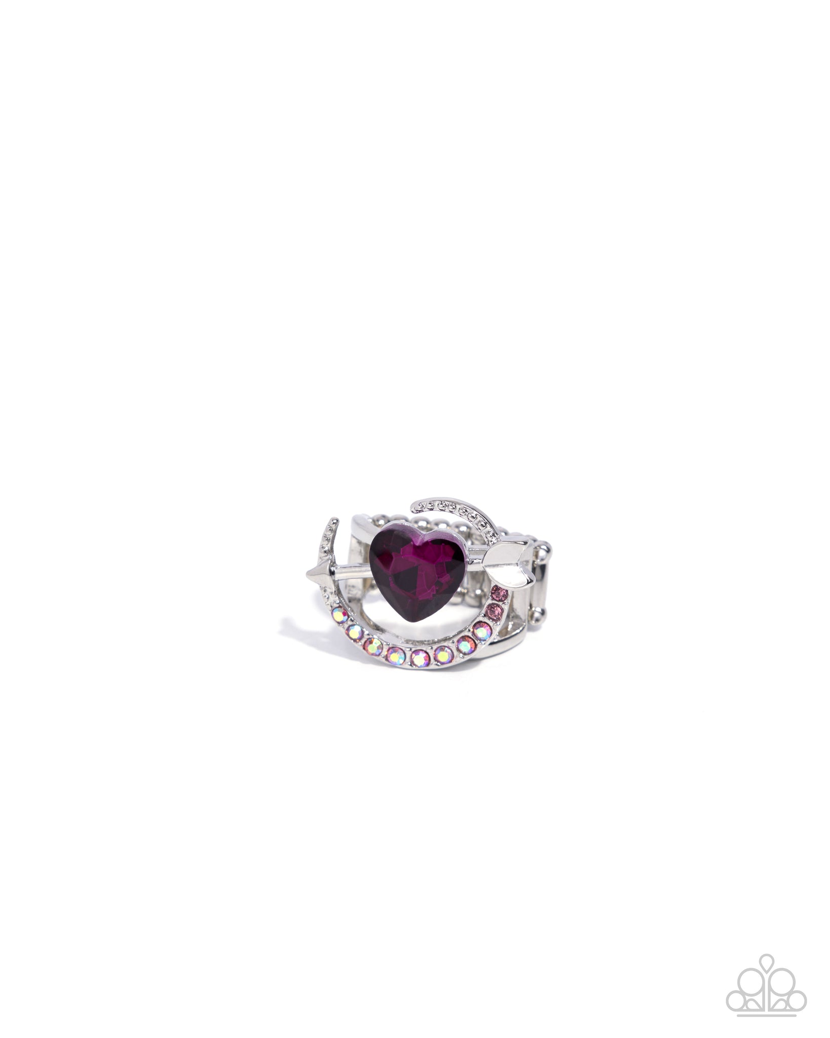 Seemingly strung along the center of a pink and pink iridescent rhinestone-dusted silver bow, a fuchsia heart gem arrow stands out atop airy silver bands for a cupid-inspired chic centerpiece. Features a stretchy band for a flexible fit.