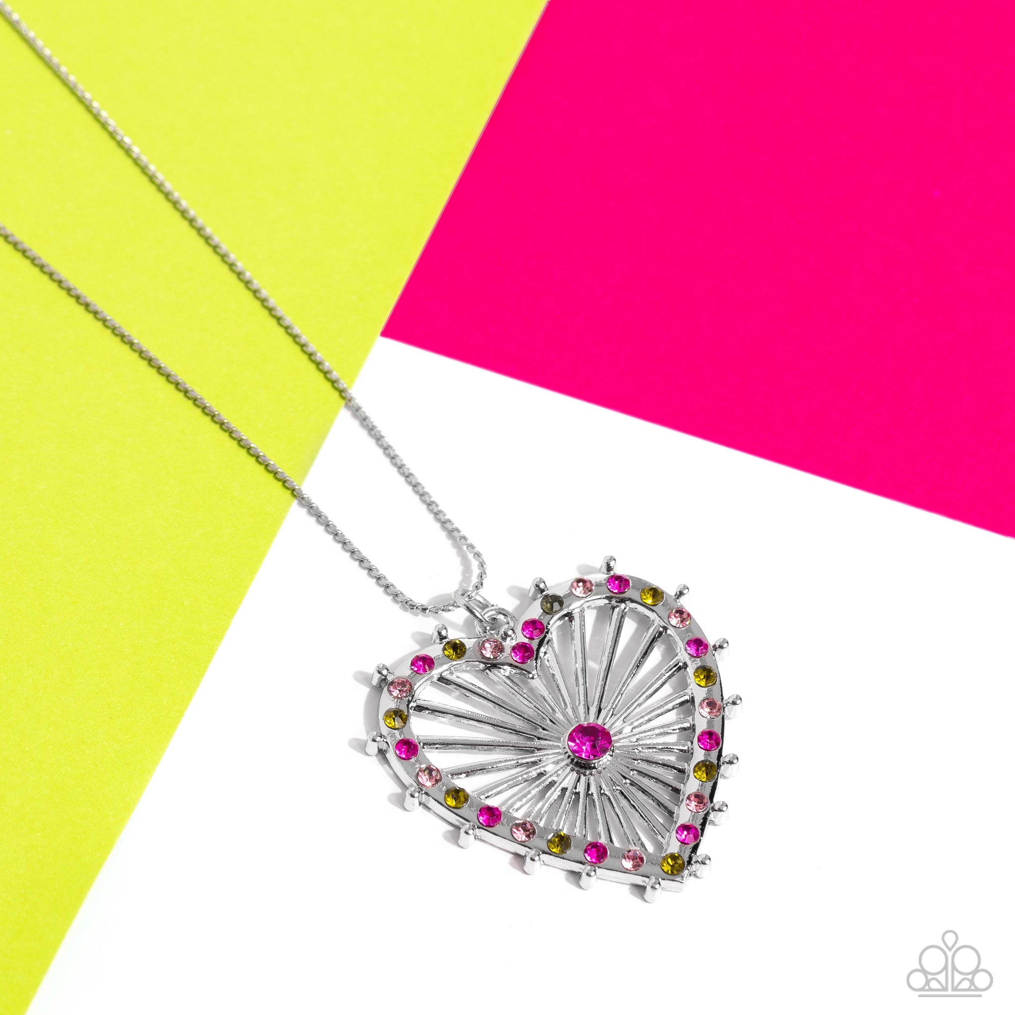 Dotted with glittery fuchsia, olive green, and light pink rhinestones, an oversized heart frame radiating with linear texture topped with a fuchsia rhinestone center swings from the bottom of a lengthened dainty silver chain for a carnival-inspired look. Features an adjustable clasp closure.