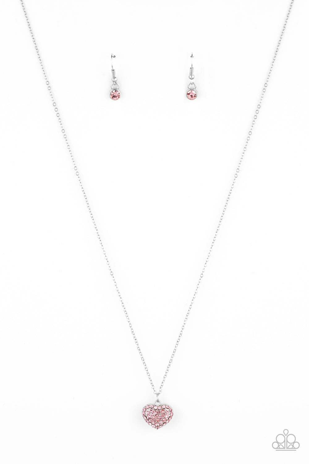 The front of a dainty silver heart frame is encrusted in glassy pink rhinestones, creating a glittery pendant below the collar. Features an adjustable clasp closure.