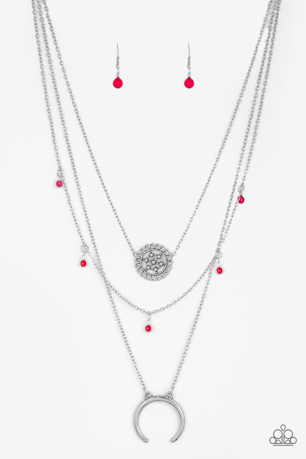 A silver floral frame swings from the uppermost chain, above a strand of faceted pink beads swinging from a shimmery silver chain. A silver crescent frame swings from the lowermost chain, creating whimsical layers down the chest. Features an adjustable clasp closure.