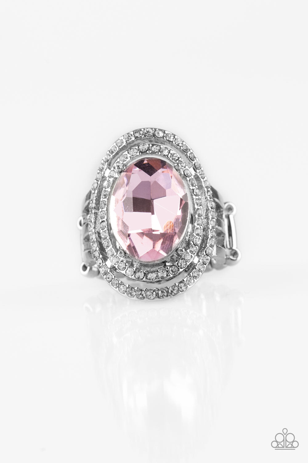 A glittery pink gem sits atop stacked silver frames radiating with glassy white rhinestones for a timeless look. Features a stretchy band for a flexible fit.