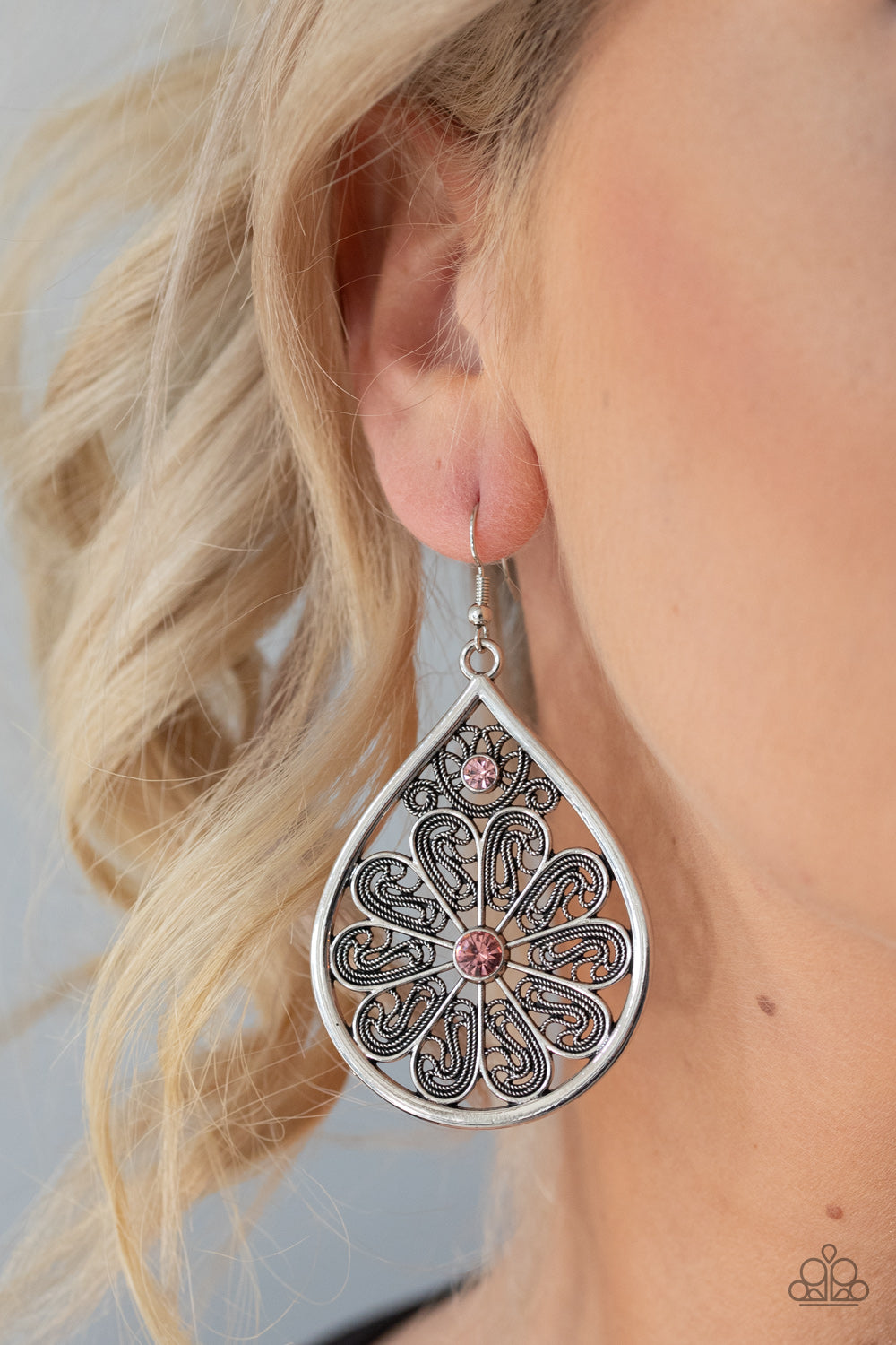 IDotted with two pink rhinestones, antiqued silver filigree swirls into a flowery teardrop frame for a whimsical look. Earring attaches to a standard fishhook fitting.