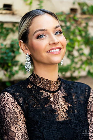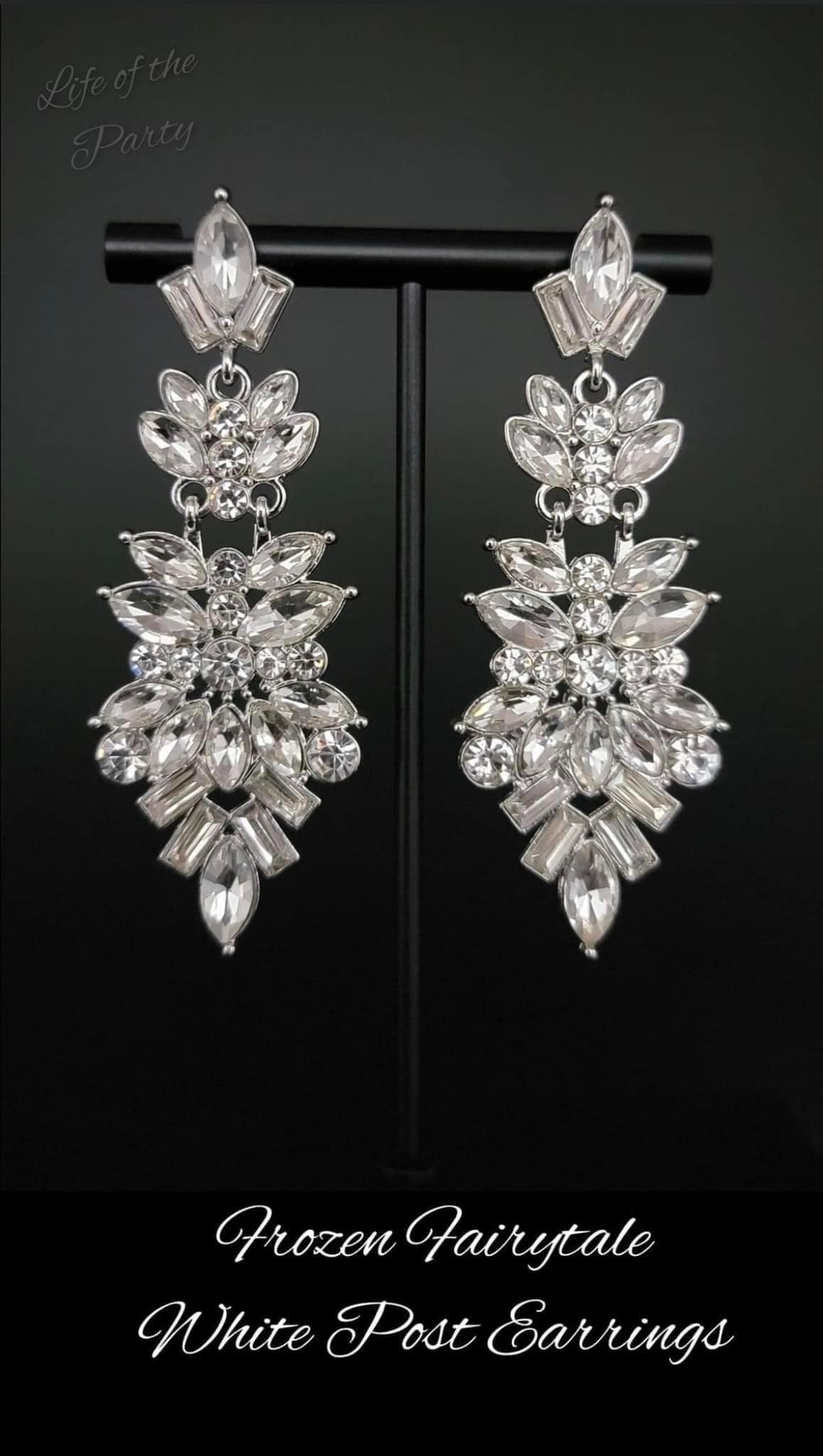 Trestles of round, marquise, and emerald cut rhinestones cluster into three sparkly segments as they link into a jaw-dropping lure, resulting in an icy statement piece. Earring attaches to a standard post fitting.