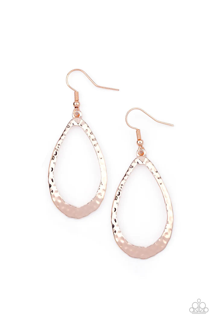 Hammered in blinding shimmer, a beveled rose gold teardrop frame swings from the ear for a classic look. Earring attaches to a standard fishhook fitting.