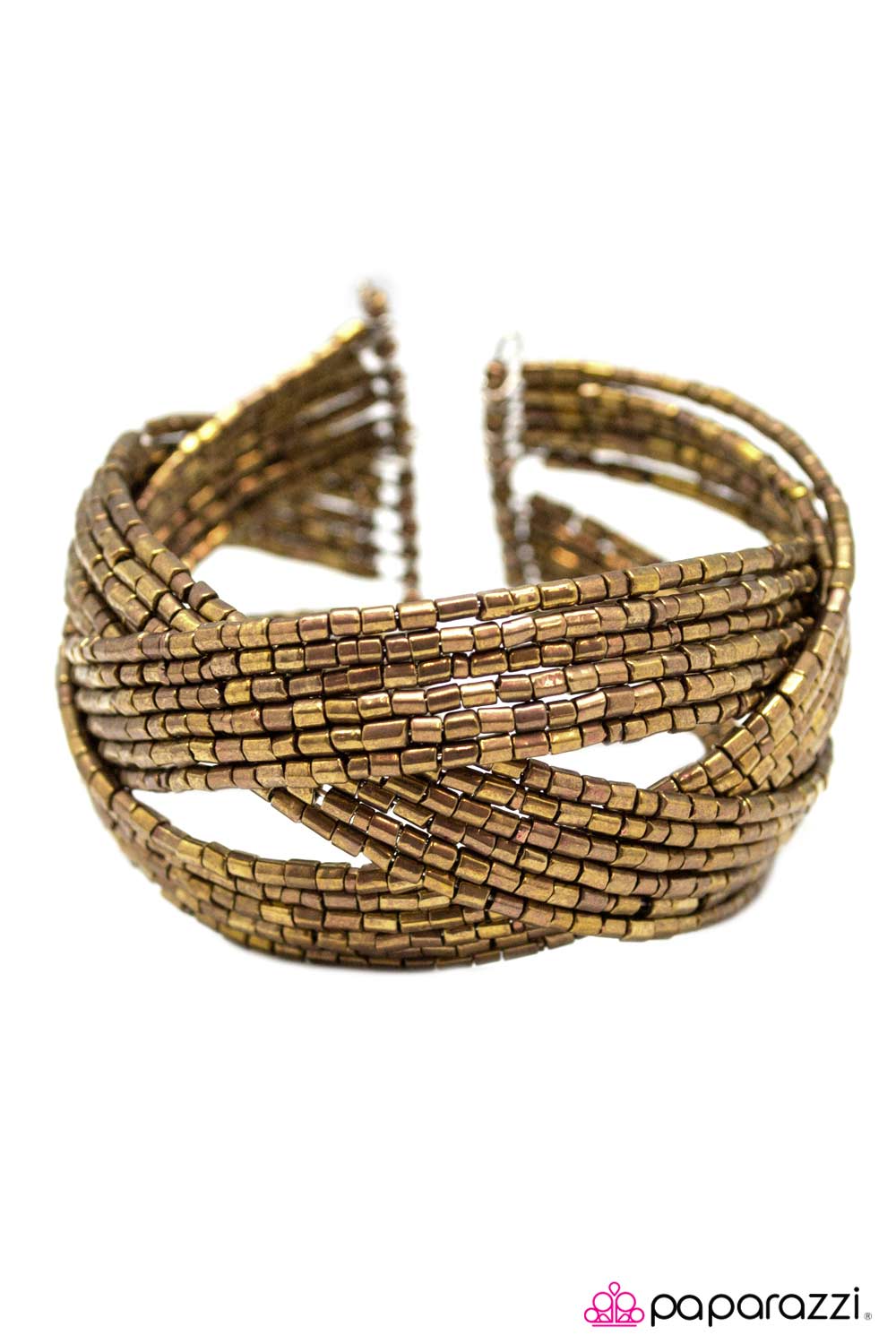 Layers of brass seed beads are braided together to create a breathtaking cuff design that shimmers brilliantly along the wrist.