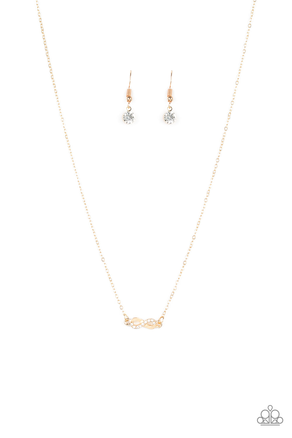 Encrusted in a section of glassy white rhinestones, a glistening gold ribbon loops into a dainty infinity pendant below the collar for a timeless look. Features an adjustable clasp closure.