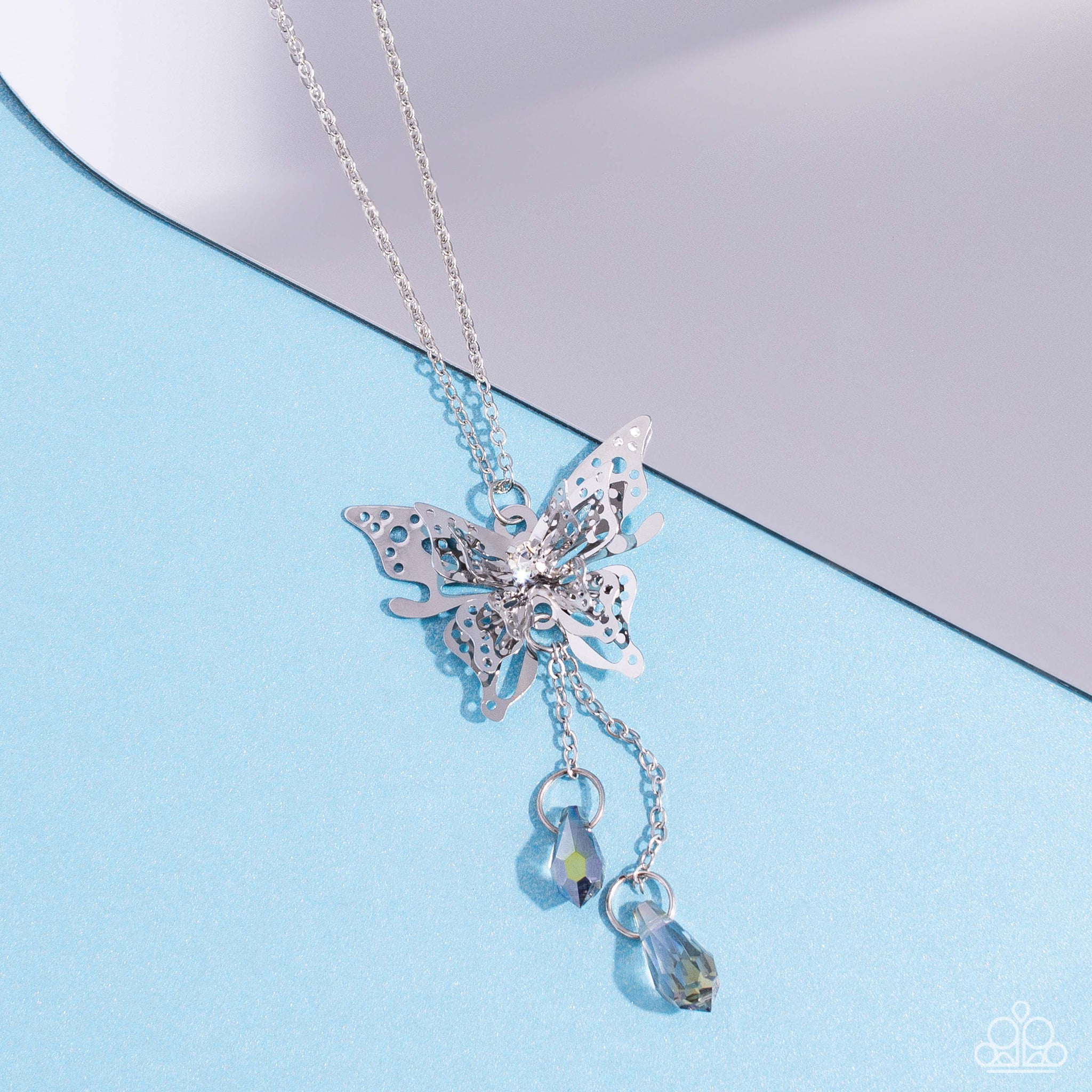 Dotted with airy whimsical cutouts, a three-dimensional, three-layered silver butterfly frame gradually decreases in size as it curls around a solitaire-pronged white rhinestone. Fluttering from a dainty silver chain, two shimmery chain tassels with three-dimensional oil spill brushed teardrop beads are added for a wanderlust flair. Features an adjustable clasp closure. Due to its prismatic palette, color may vary.