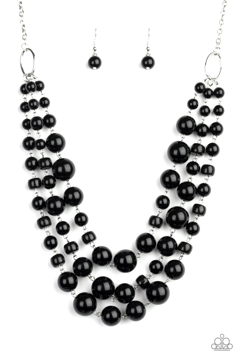 Two shimmery silver ovals give way to scattered layers of mismatched strands of polished black beads, creating bubbly layers below the collar. Features an adjustable clasp closure.