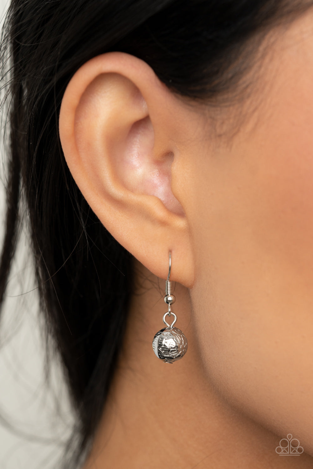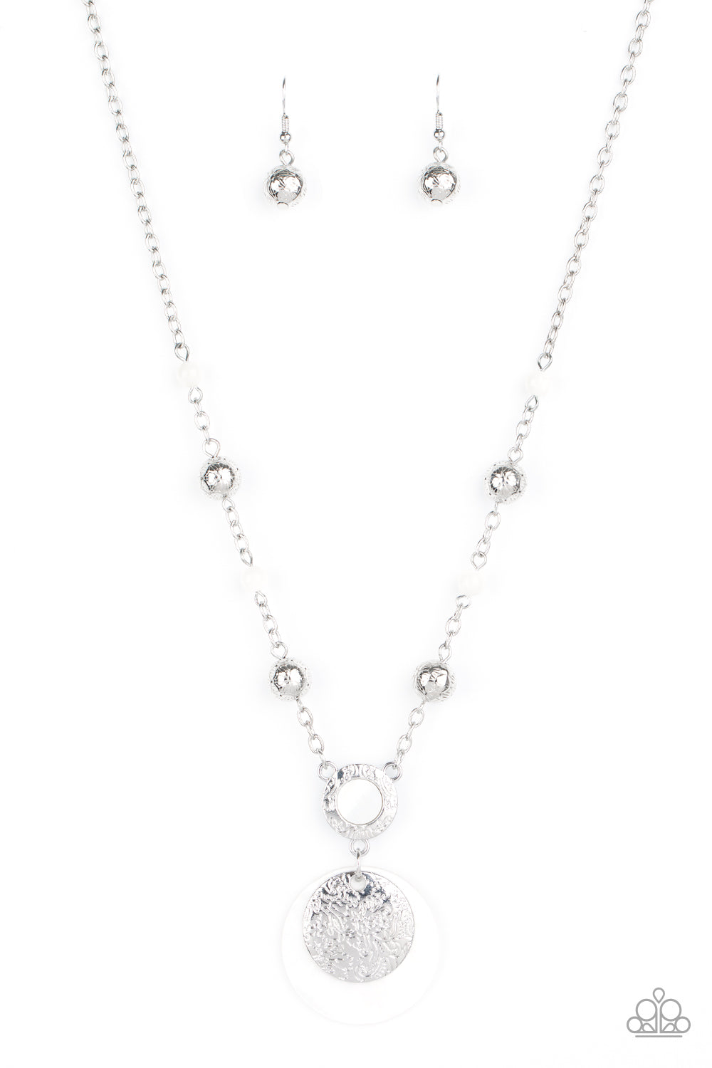 A dainty collection of ornate silver beads and white stone beads dot a dainty silver chain, giving way to a hammered silver ring featuring a shell-like center. A hammered silver disc and white shell-like disc swing from the bottom, creating a summery pendant. Features an adjustable clasp closure.
