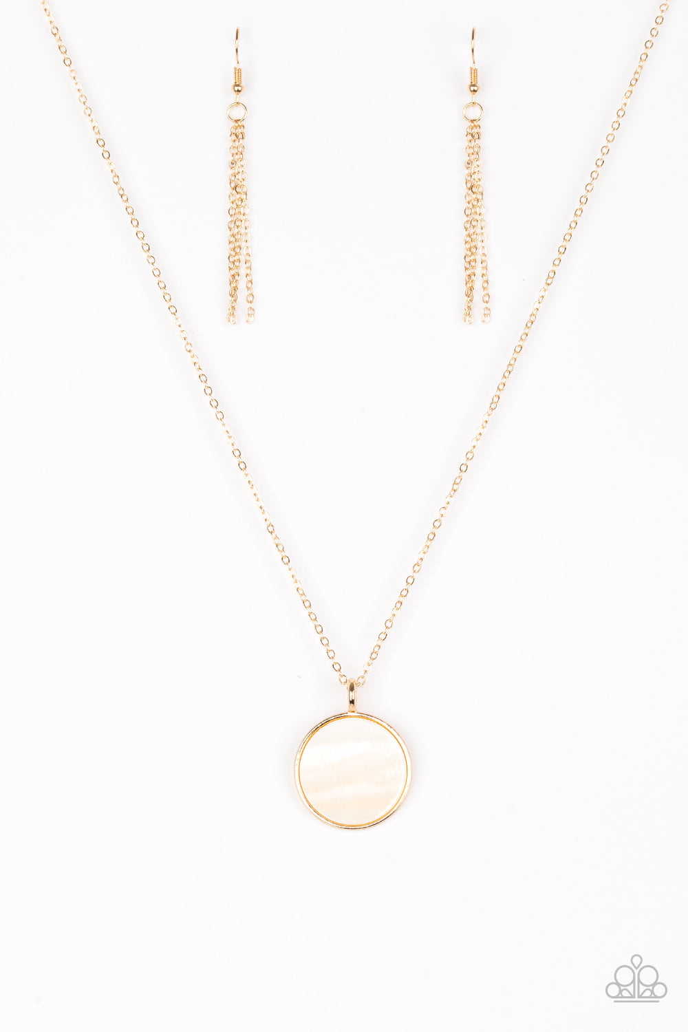 A flat shell-like pendant swings from the bottom of a dainty gold chain below the collar for a refined look. Features an adjustable clasp closure.
