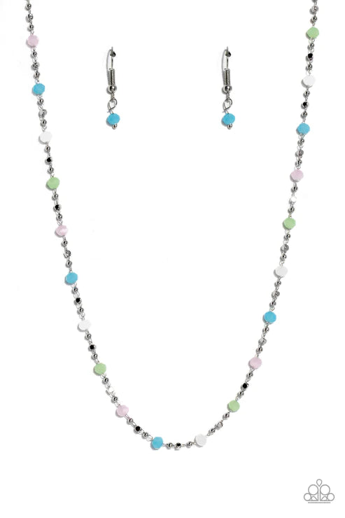 Infused on a dainty silver chain, faceted beads in shades of blue, pink, green, and white alternate with dainty silver beads and square beads for a refreshing, simple statement. Features an adjustable clasp closure.