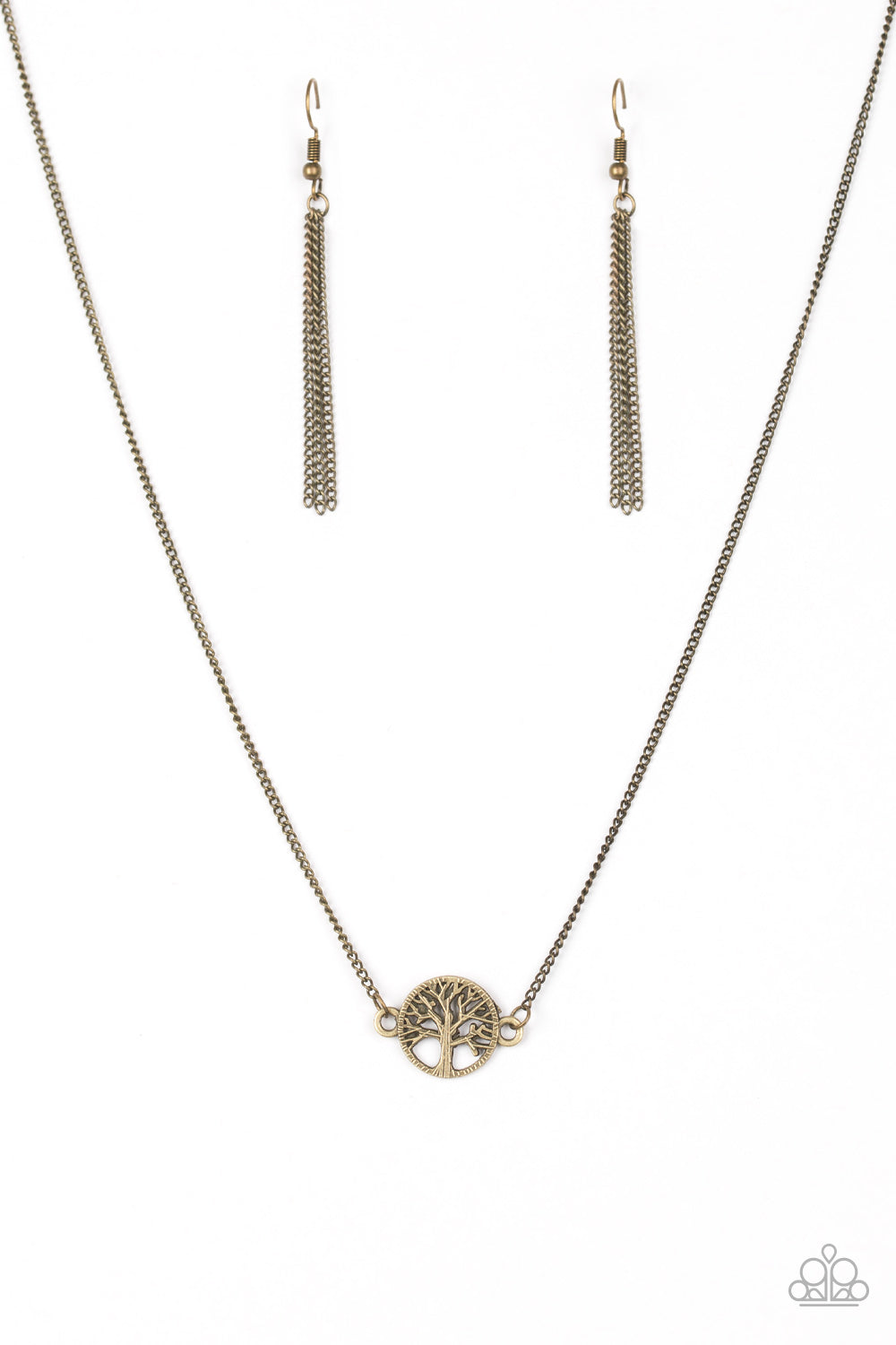 A dainty tree charm attaches to a shimmery brass chain, creating a whimsical pendant below the collar for a seasonal look. Features an adjustable clasp closure.