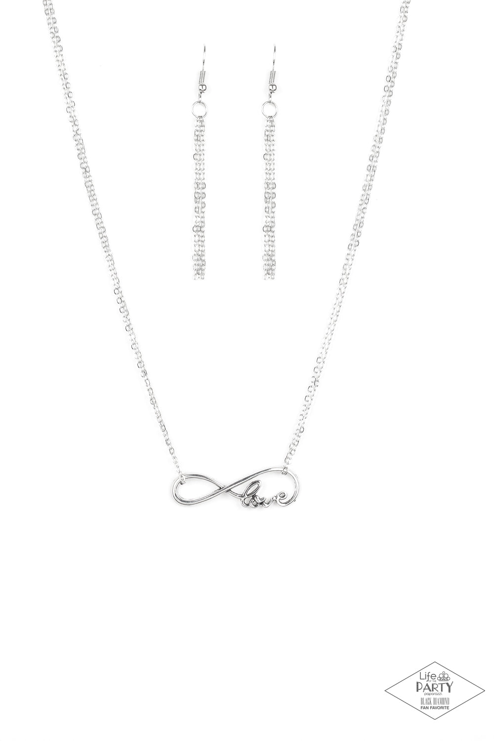 A dainty silver infinity charm swoops below the collar, spelling out the word “Love” in its bottom corner. Dainty silver chains loop around the airy charm, completing the delicate design. Features an adjustable clasp closure.