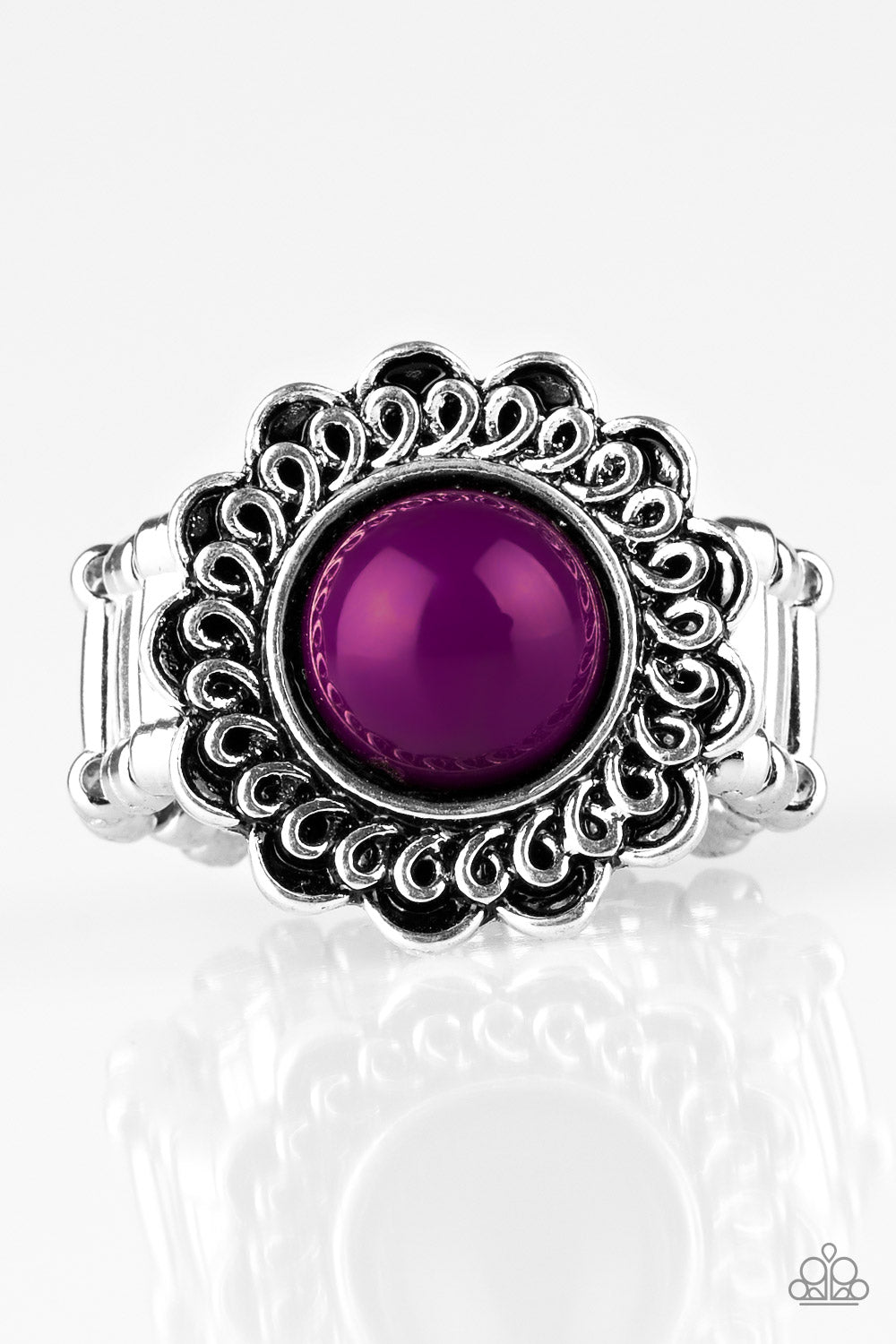 A vivacious purple bead is pressed into the center of a shimmery floral frame radiating with swirling detail. Features a stretchy band for a flexible fit.