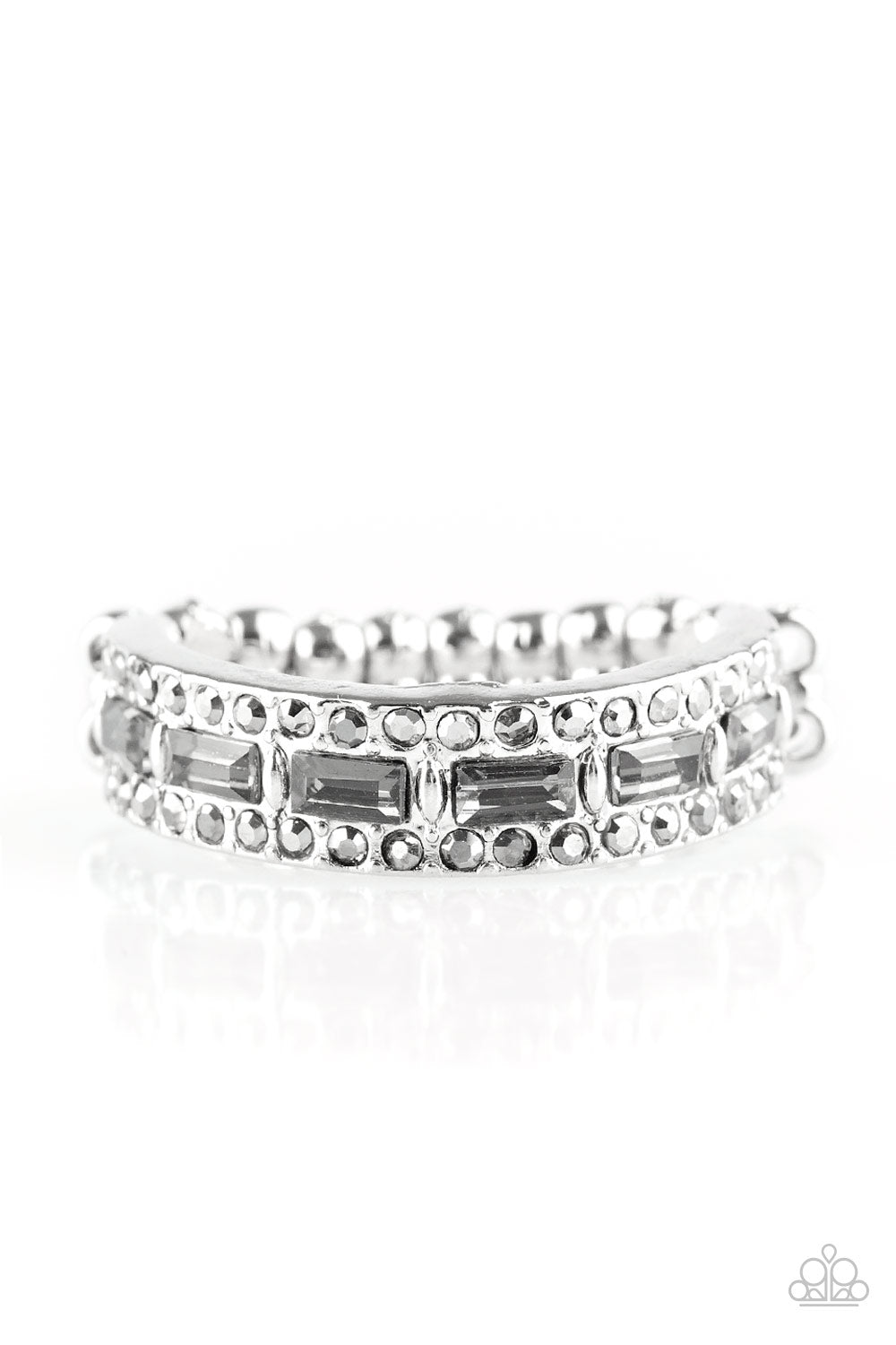 Featuring classic round and regal emerald style cuts, smoky and glassy hematite rhinestones are encrusted along a dainty silver band for a refined look. Features a dainty stretchy band for a flexible fit.