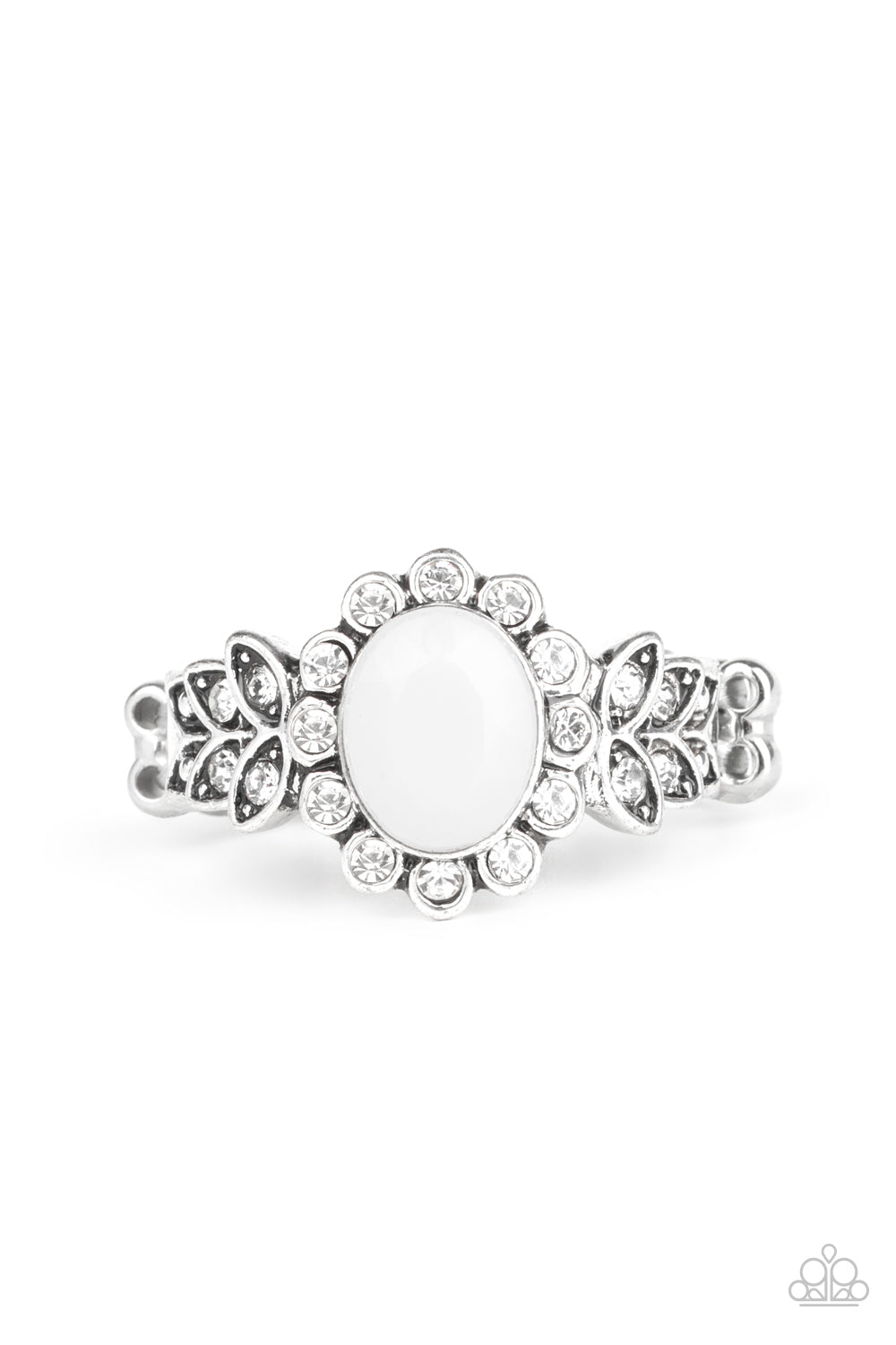 Encrusted in glittery white rhinestone petals, a dainty white bead is pressed into a leafy silver frame dazzling with white rhinestone accents. Features a dainty stretchy band for a flexible fit.