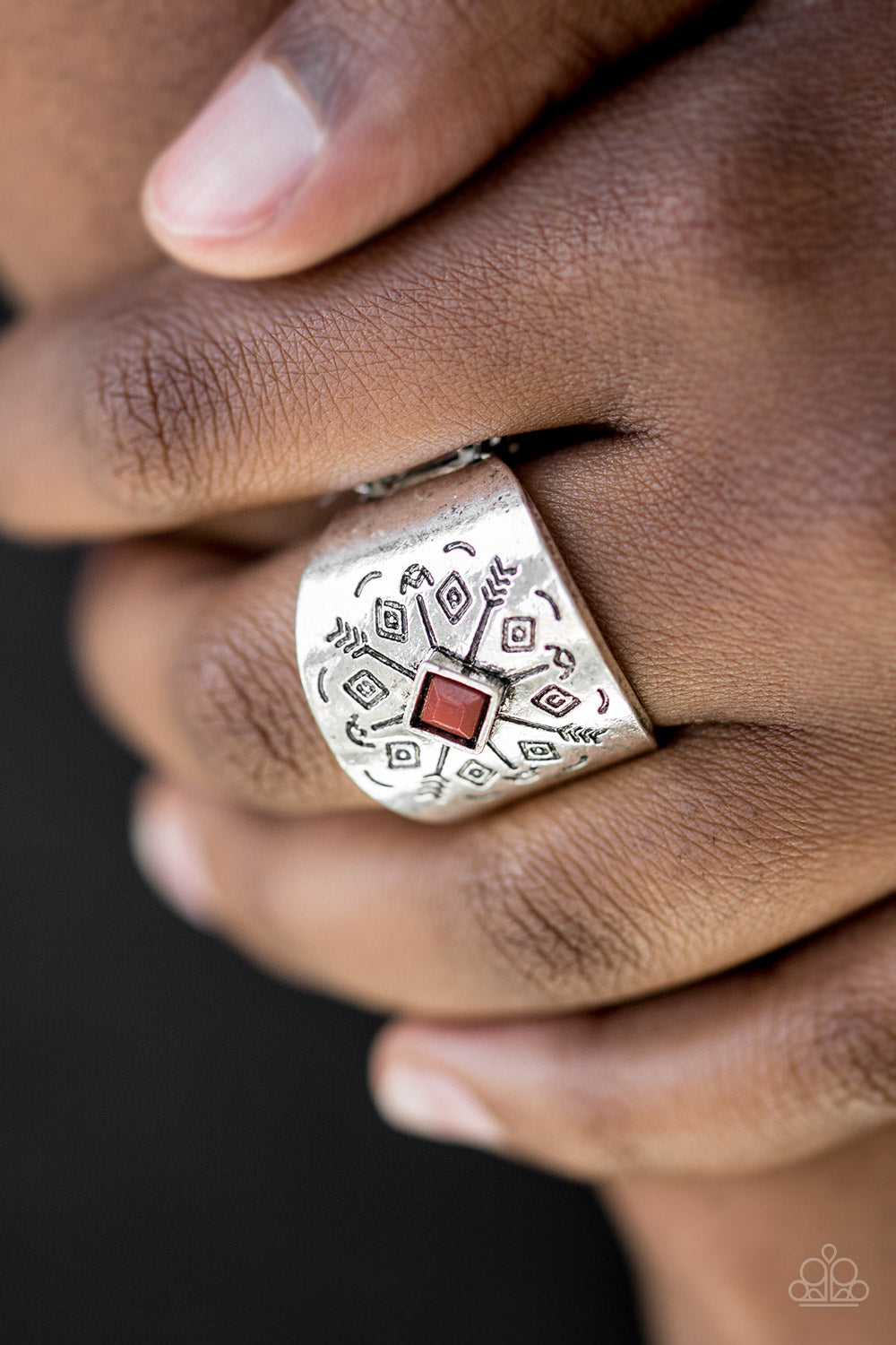 Stamped in arrow-like patterns, a thick silver band wraps across the finger. A faceted brown bead adorns the center of the band, adding a colorful finish to the tribal inspired palette. Features a stretchy band for a flexible fit.
