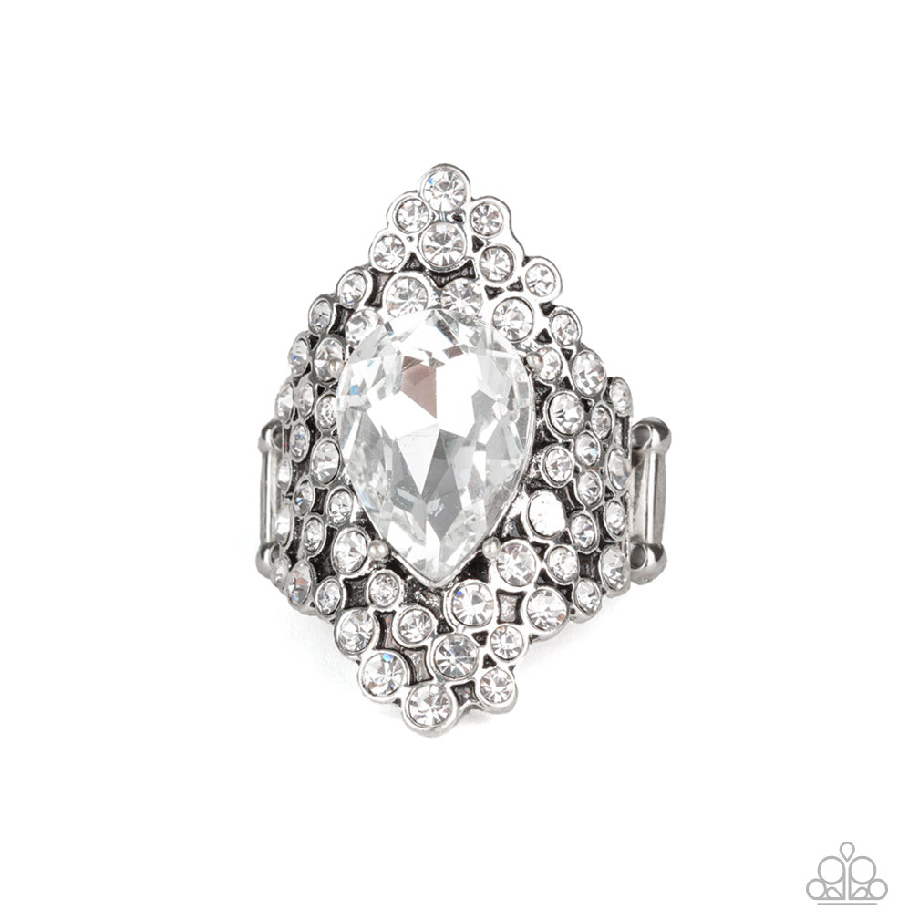 Featuring a regal teardrop cut, a glittery white gem is pressed into the center of a sparkling backdrop of glassy white rhinestones, creating a blinding centerpiece atop the finger. Features a stretchy band for a flexible fit.
