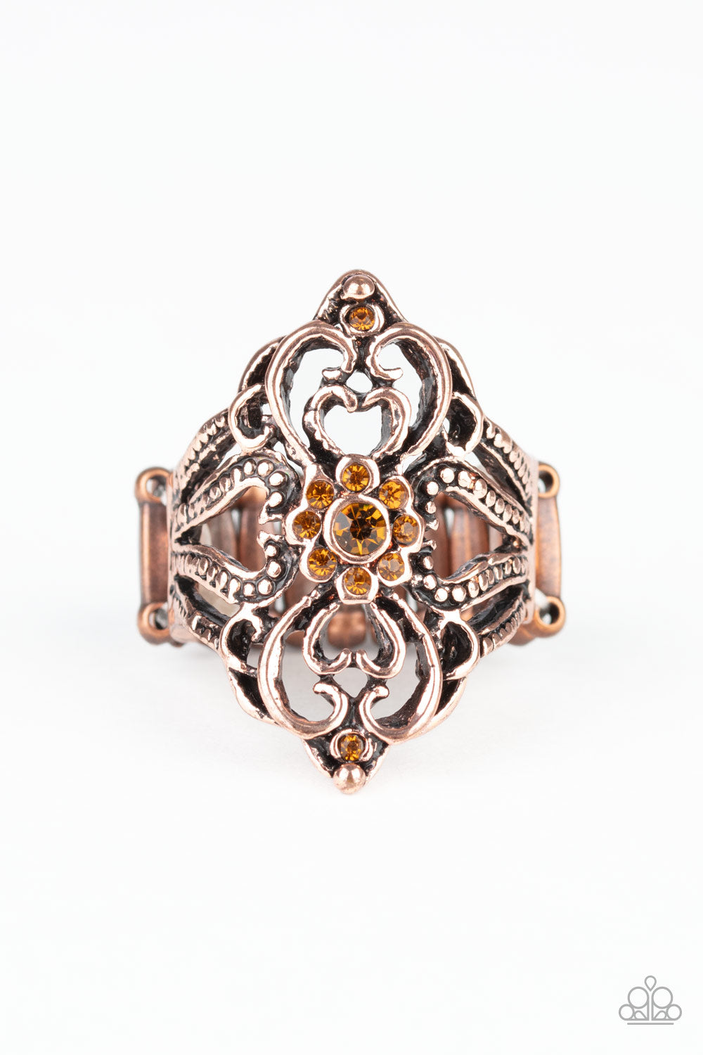 Dainty topaz rhinestones gather into a glittery floral centerpiece atop a copper frame swirling with heart shaped filigree. Features a stretchy band for a flexible fit.