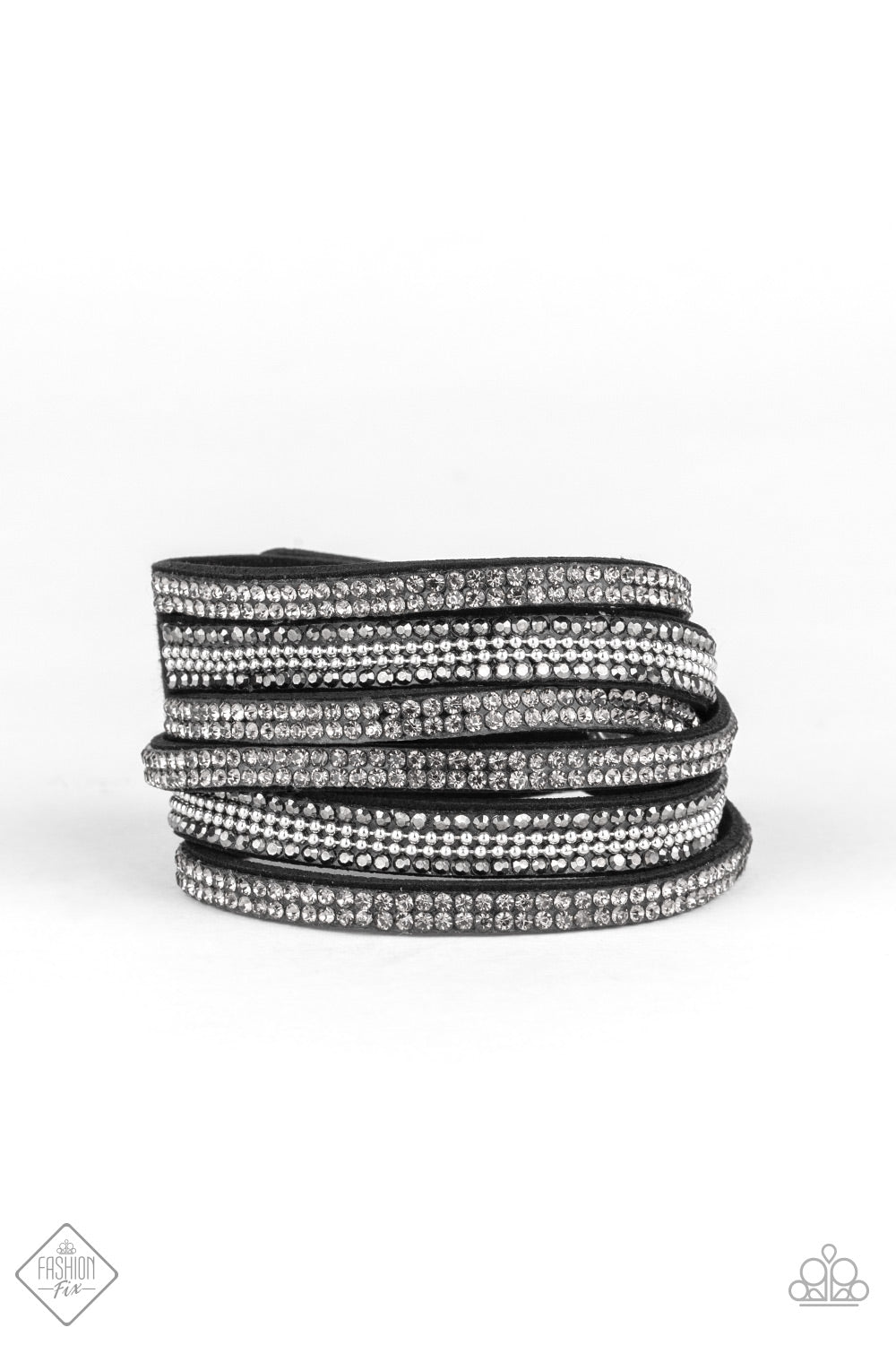 Rows of smoky and hematite rhinestones and strands of glistening silver ball chains race along three strands of black suede for a sassy look. The elongated band allows for a trendy double wrap design. Features an adjustable snap closure.