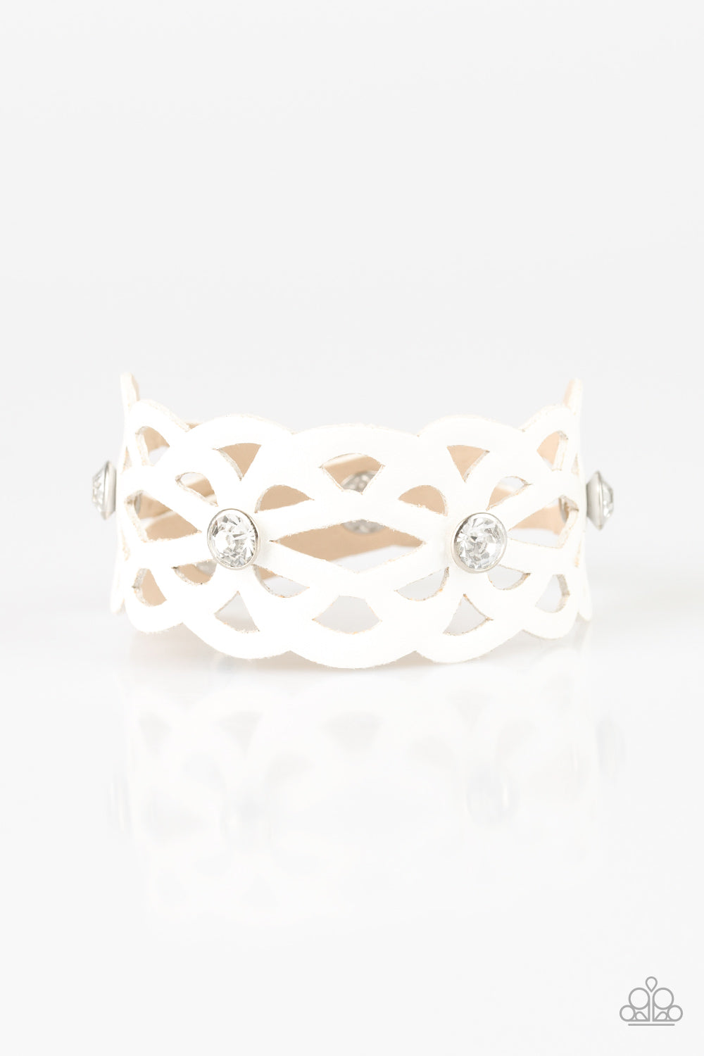 Dotted with glittery white rhinestones, a floral patterned leather band wraps around the wrist for a seasonal look. Features an adjustable snap closure.